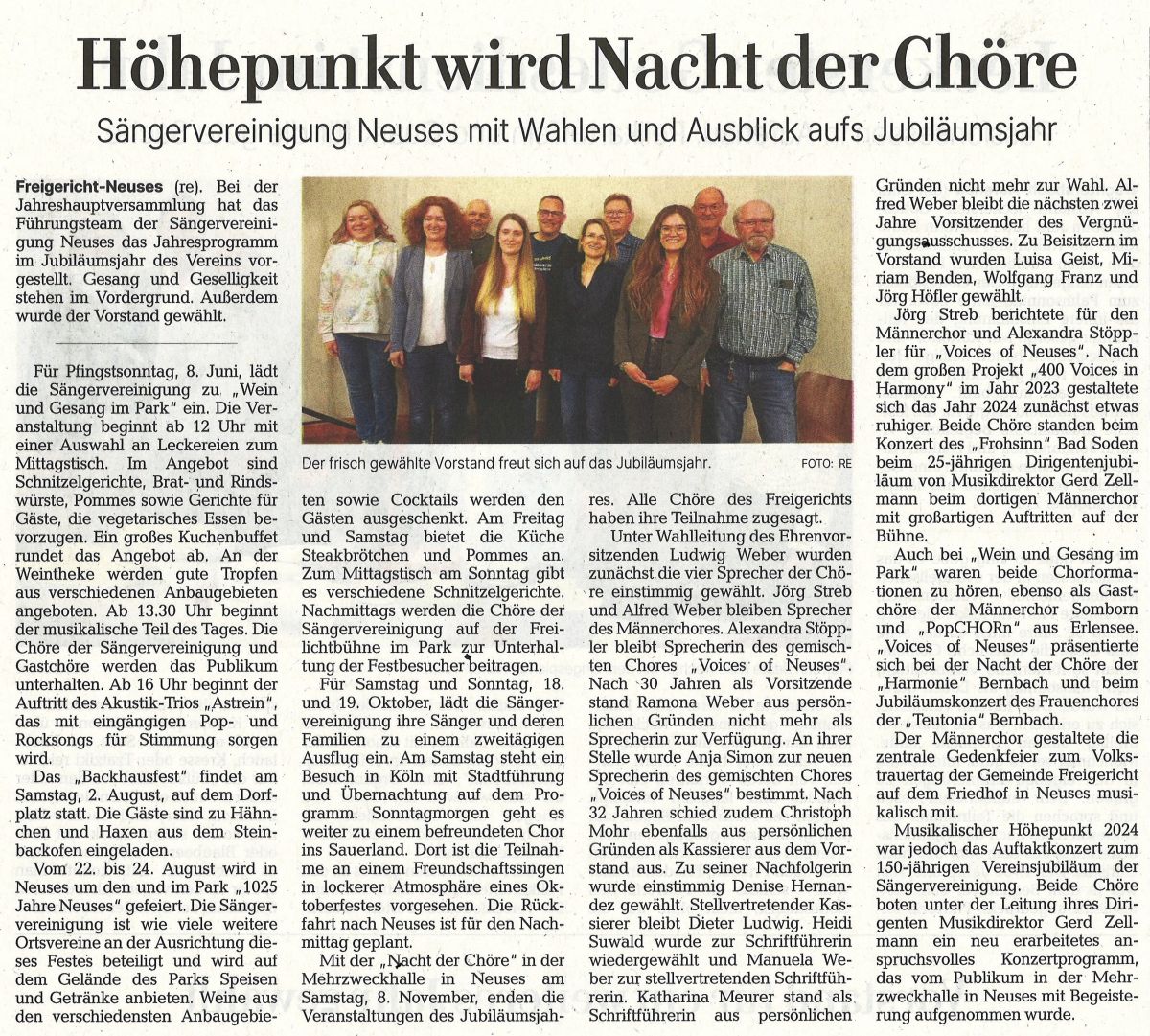 Die Sängervereinigung Neuses hat am Freitag, 28. März 2025, ihre Jahreshauptversammlung abgehalten. Im Zentrum der Versammlung standen die Neuwahlen des Vorstands, die wichtige personelle Veränderungen mit sich brachten.