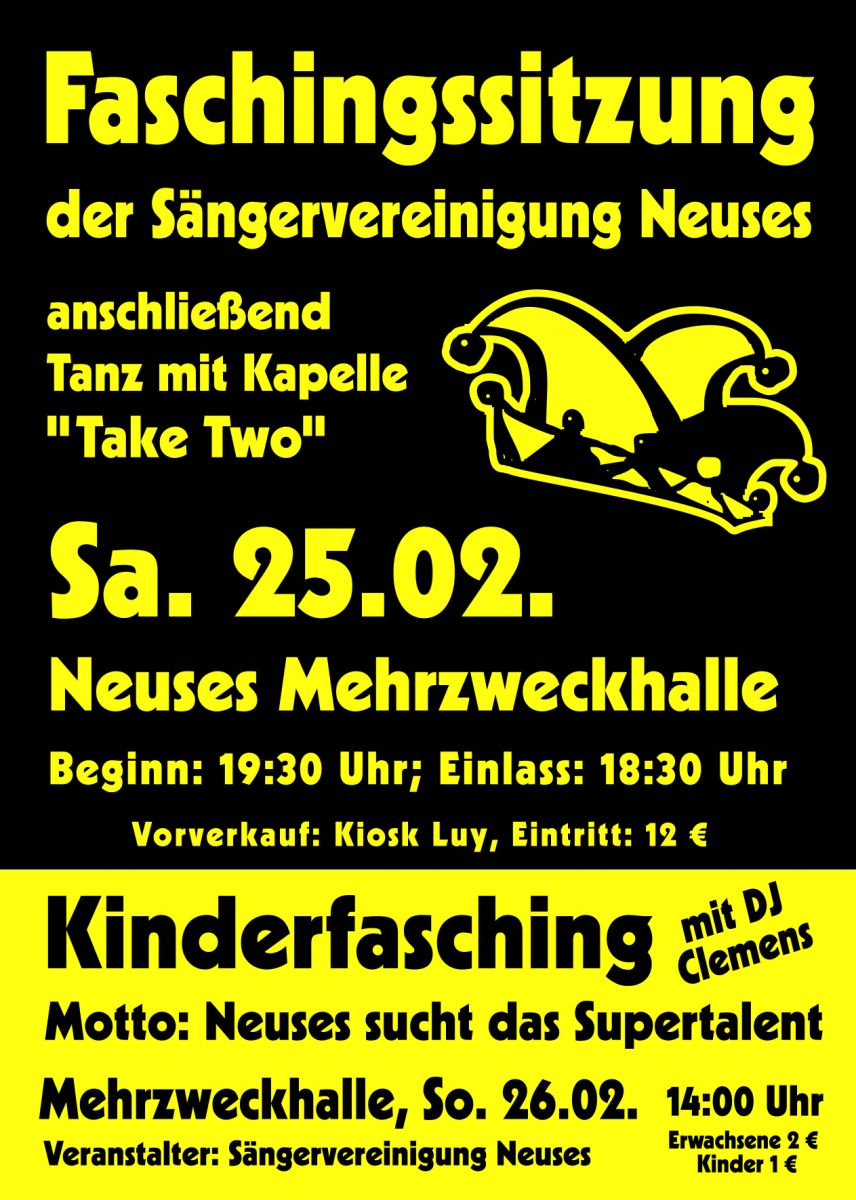 An Faschingsamstag ist es wieder soweit. In der Neusischer 'Hall steigt die Narrensitzung der Sängervereinigung mit zahlreichen Büttenreden, Gesangsbeiträgen und grazilen Tanzeinlagen. JETZT Ticket sichern beim Kiosk Luy in Neuses oder per Mail unter info@saenger-neuses.de